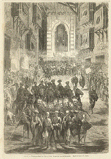 O Gladness! at length it sounds that gun from the citadel. Simultaneously rises the sweet cry of thr mu'ezzin, calling men to prayer, and the second cannon booms from the Abbasiyah Palace, - "al-Fitar! al-Fitar" fast-breaking! fast-breaking! shout the people, and a hum of joy rises from the silent city. Your acute ears waste not a moment in conveying the delightful intelligence to your parched tongue, empty stomach, and languid limbs. You exhust a pot full of water, no matter its size. You clap hurried hands for a pipe; you order coffee; and provided with these comforts, you sit down, and calmly contemplate the coming pleasures of the evening.